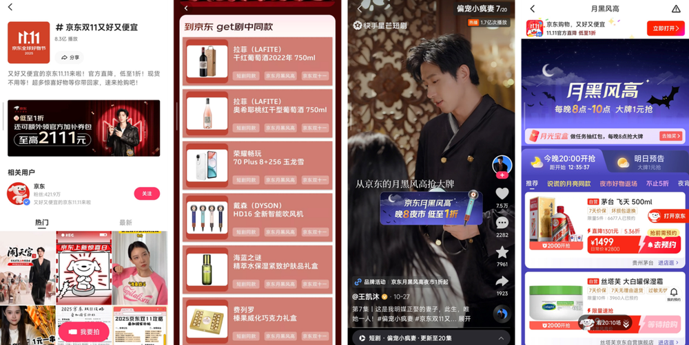 短剧既是难得的品牌建设阵地,也是极为高效的销售渠道:用户在每一集下方点击话题词#京东双11又好又便宜,通过话题页Banner可以跳转“京选剧场”好物专区,轻松到京东获取剧中同款;观看植入剧集时界面会出现品牌活动链接,精准导向京东“月黑风高”频道,方便用户直接下单购买。这种“边看边买”的体验,无缝衔接起内容场与消费场,极大缩短品牌曝光与销售转化之间的路径。