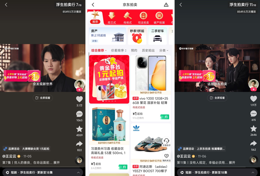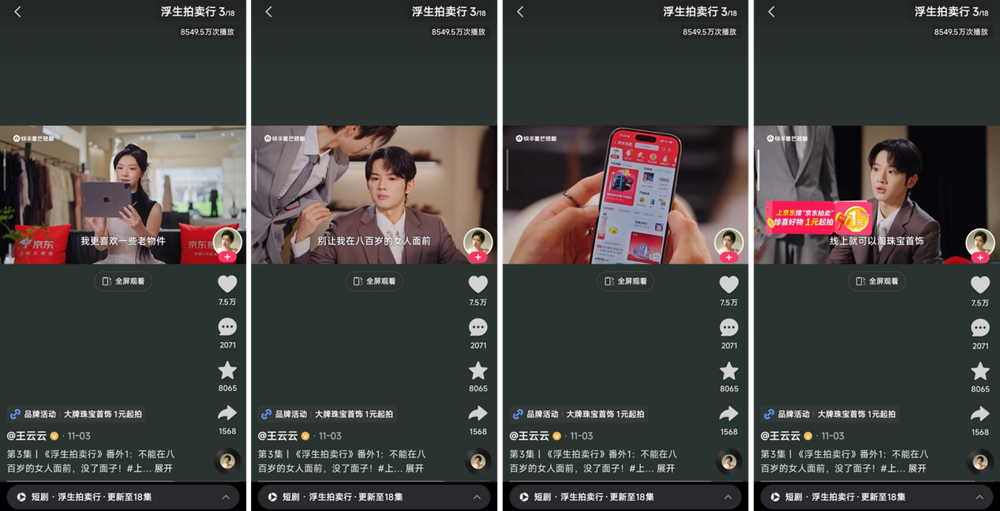 短剧营销之火持续蔓延,逐渐发展为电商大促的标配。今年双11期间,京东再次联动快手星芒短剧,采取“定制短剧+品类绑定+情绪驱动”的模式,推出了「京选剧场」并独家冠名7部精品短剧。其中,11月3日上线的《浮生拍卖行》,就凭借“内容为骨,商业为脉”的思路,充分展现出快手与京东在品牌短剧玩法上的创新。
