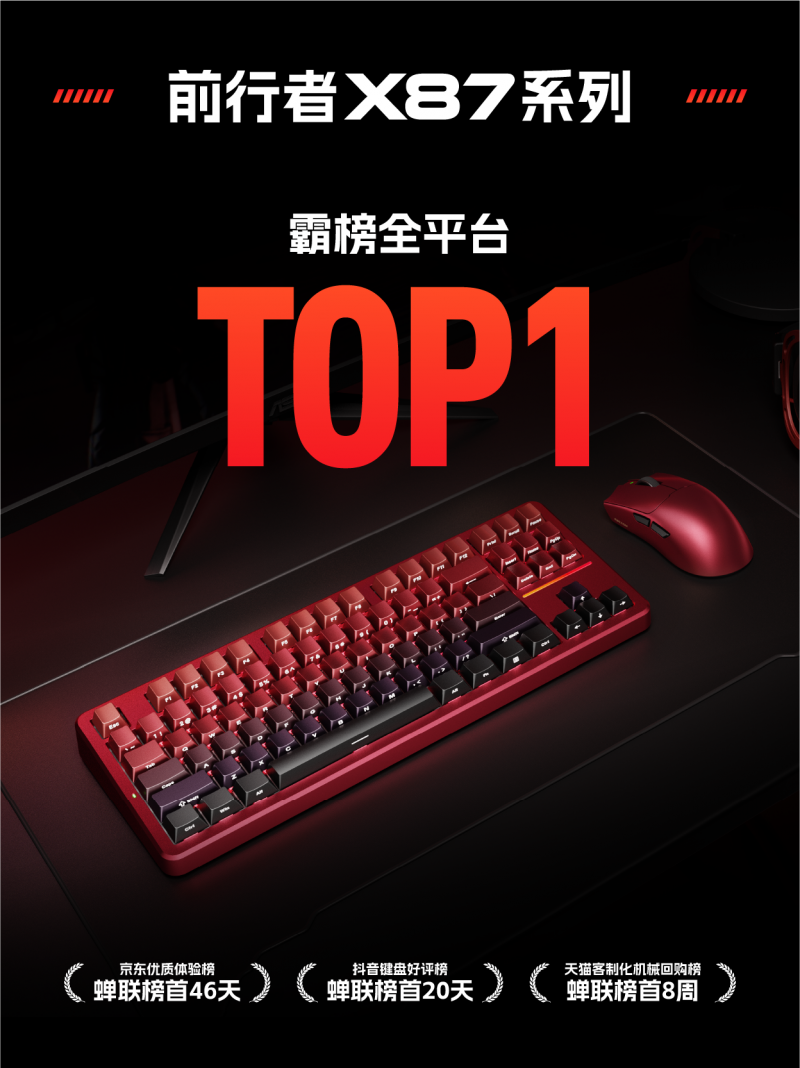 此外,前行者X87系列键盘一举拿下键盘“京东优质体验榜TOP1”、“抖音键盘好评榜TOP1”和“天猫客制化回购榜TOP1”三项榜首。