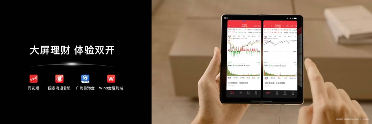 在金融理财场景中,HUAWEI Mate X7在展开状态下可支持多窗口并行,用户无需切换界面即可同时深入查看多个版块详情,时刻把握瞬息万变的交易机会;同时HUAWEI Mate X7对Wind金融终端等专业应用的支持,令行情刷新更快人一步,数据分析更为深入,时刻赋予用户专业交易员般的操盘体验。