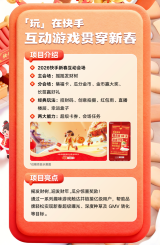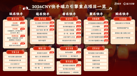 春节作为中国最盛大的传统节日,是快手用户活跃的高峰期,更是品牌不容错过的关键营销节点。近日,快手2026春节招商项目通案正式发布,围绕“玩、逛、看、聚、购”在快手,打造马年新春超级互动和内容盛宴,同时集结聚星达人、品牌产品、营销科学等丰富资源,为用户营造热闹喜庆年味氛围,为品牌搭建新春营销高光舞台,携手共迎温暖欢腾的中国年。
