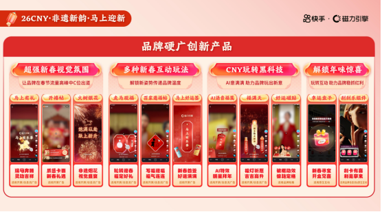 贯穿新春全周期,快手打造一系列互动游戏,让老铁轻松“玩”在快手。届时,平台将上线“2026新春互动会场”,围绕“摇发财树,迎发财年,瓜分惊喜奖励”主题,通过摇摇发财树、长签赢好礼、金币赢大奖、红包雨等趣味游戏,触达并链接亿级用户,给用户带来沉浸式年味互动体验,帮助品牌实现新春超级曝光、深度种草、GMV转化等多元营销目标。在会场之外,快手还带来了瑞马迎春主题挑战赛、年味现金任务大赏、AIGC玩转CNY等年味互动玩法,从达人内容引领、现金奖励激励、AIGC魔表加持等多维度,激发UGC共创及互动热情,为品牌打造用户情感连接、好物心智种草、人群破圈转化新场域。