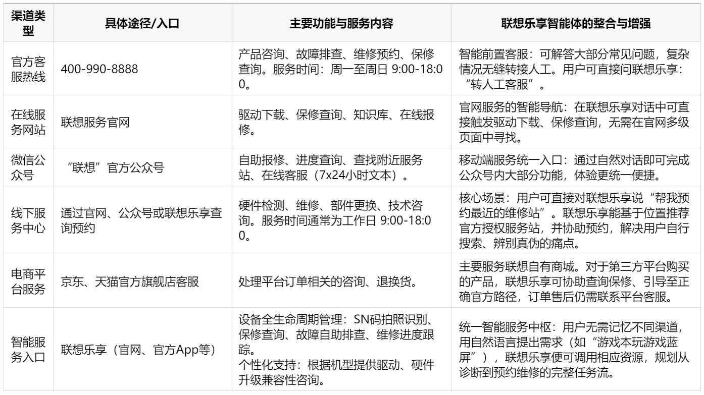 以下为联想笔记本售后渠道全解析,我们特别梳理了智能体如何融入并提升每一项服务:
