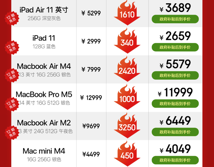 对于希望在年末升级装备的消费者,京东12.12为MacBook带来限时直降、10%政府补贴、以旧换新再补300元起等多重福利。其中,13英寸MacBook Air M4(10+8核)16+256G版,限时直降1800元,国家补贴10%,以旧换新补贴300元起,到手价低至5579元;13.6英寸MacBook Air M2(8+10核) 24+512G版限时直降3250元,到手价6449元;2025年款MacBook Pro 14英寸M5(10+10核)16+512G版,政府补贴1000元,到手价11999元。