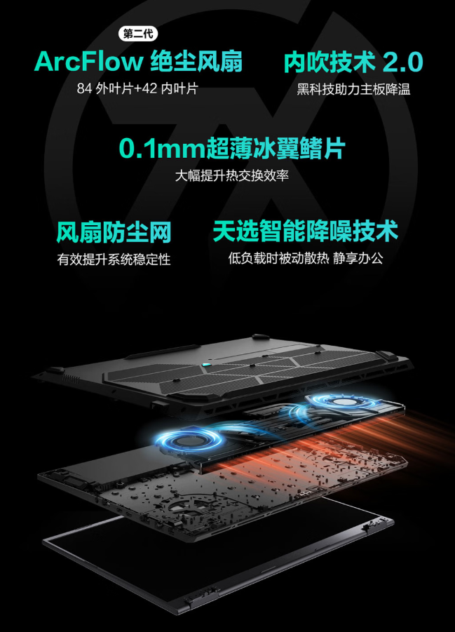 这款机型之所以能实现“性能-静音-散热”的平衡,离不开三大技术的协同。酷睿Ultra 200HX高能效架构带来50%能效提升,通过精准控制游戏场景下的CPU功耗,在几乎不影响帧率的前提下减轻散热压力;第二代乾坤散热系统采用双风扇三热管+内吹架构,同功耗下可降低噪声9dB,提升风量7.6%,机身后侧出风口彻底解决了侧面“烤手”痛点;英特尔APO应用优化器与DTT动态功耗分配技术,通过AI算法智能调度线程与功耗,最大化性能与能效。