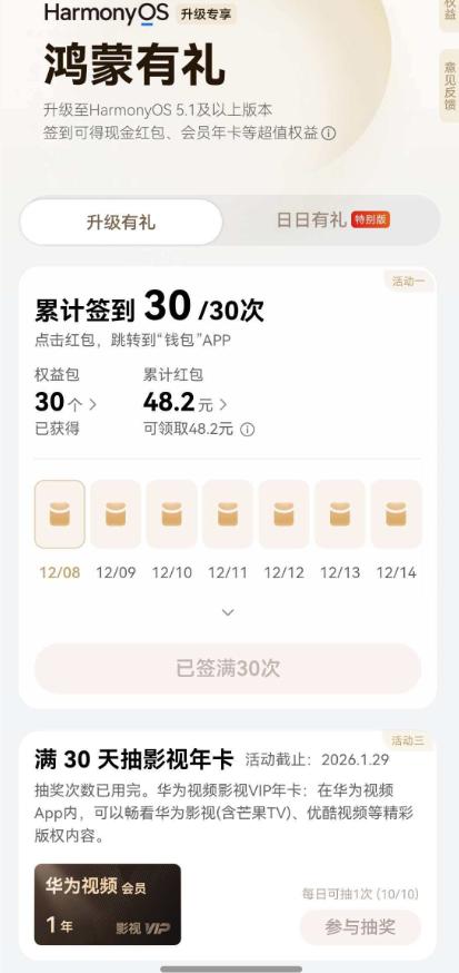 除了这个压轴大奖,平时的福利也不少。比如签到抽奖,每天签到就能领现金红包或者随机权益,随手点一下的事儿,比如每天领一张7天的华为视频影视会员权益,连续领10天那就是两个半月,这不也省下不少钱吗?还有首次签到后第30天起还有机会抽到华为影视会员+优酷小屏会员的组合年卡包,双重快乐更超值。