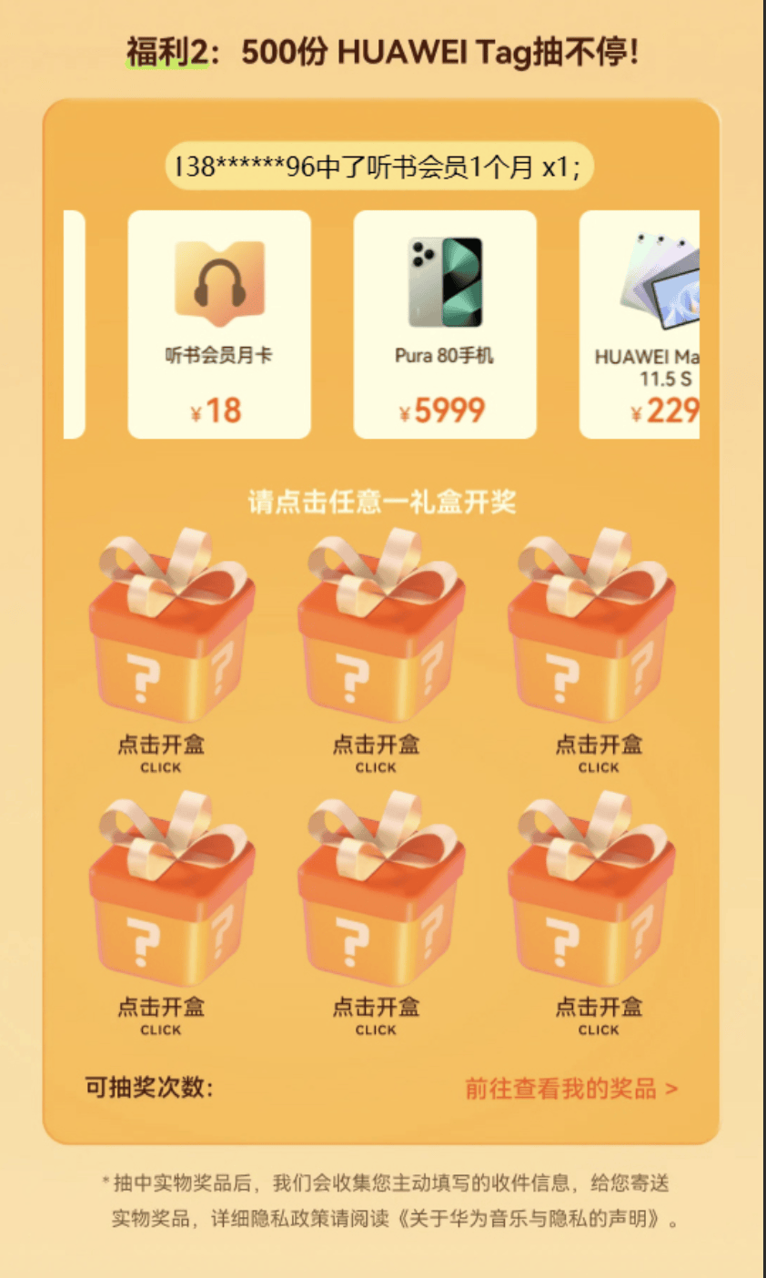 凡在双12活动期间开通年卡,除了实现听歌自由,还能直接领取华为主题、华为阅读、华为视频3个月会员。这还没完——所有开通年卡的用户都能参与限时抽奖,Pura 80 手机、HUAWEI MatePad 11.5S、HUAWEI Sound X4 智能音箱、HUAWEI FreeBuds Pro5 耳机、华为智能体脂秤 3,还有足足 500份 HUAWEI Tag 防丢精灵,以及随机艺人周边/签名照、听书会员月卡等你“认领”!