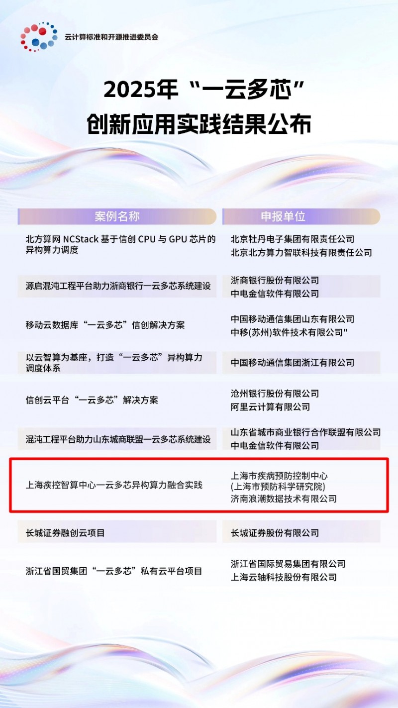 日前,中国信通院2025年“一云多芯”创新应用实践名单正式揭晓,上海市疾病预防控制中心(上海市预防科学研究院)联合浪潮数据提报的“上海疾控智算中心一云多芯机构算力融合实践”成功入选。