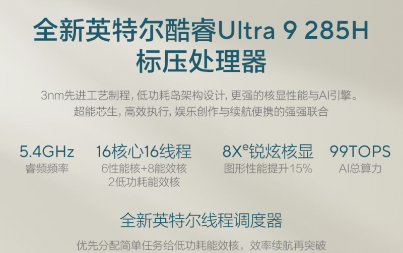 性能核心上,该机搭载酷睿Ultra 9 285H标压处理器,采用3nm工艺与16核心16线程设计,最高睿频可达5.4GHz,配合32GB LPDDR5X高频内存与1TB PCIe 4.0 SSD,无论是运行大型设计软件、处理超高清素材,还是同时开启50+浏览器标签页与多任务办公,都能保持流畅响应。99TOPS的AI总算力让本地大模型运行、AI绘图等功能响应迅速,本地运行80亿参数大模型性能较上一代提升最高可达3.3倍,为创作提供强大算力支撑。
