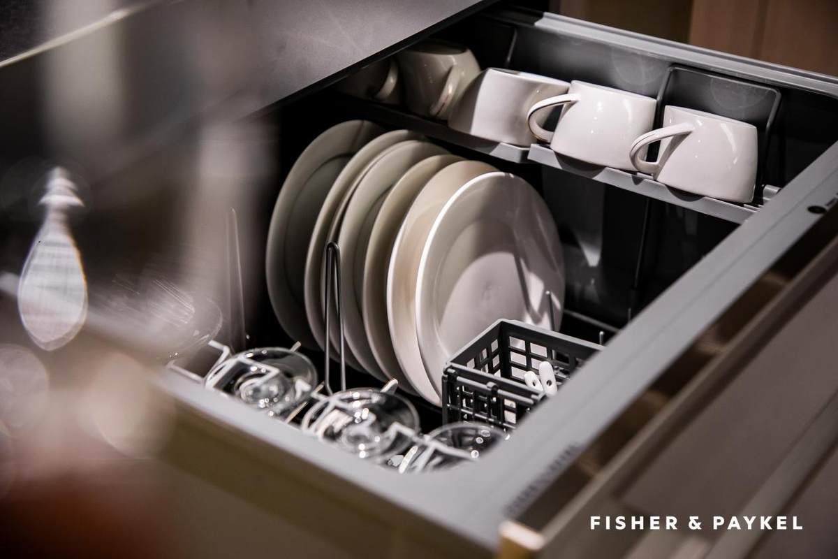 斐雪派克与四代住宅的适配,不只是品牌与产品的组合,更是一种生活理念的契合。斐雪派克早在2012年就提出了“社交厨房”的概念,这与锦绣金陵采用的客餐厨一体设计十分匹配——让厨房不再只是做饭的地方,更成为一家人交流互动的中心。比如其抽屉式洗碗机就是一个很好的例子:采用抽屉式设计,轻轻一推就能打开,不用弯腰,内部空间很大,能放8套餐具,完全能满足家庭聚会的需求。这款洗碗机机身超薄、动力强、噪音低,还非常节能节水,比手洗节省约80%的用水。这既展现了斐雪派克对品质的坚持,也与四代住宅倡导的可持续生活理念相呼应。