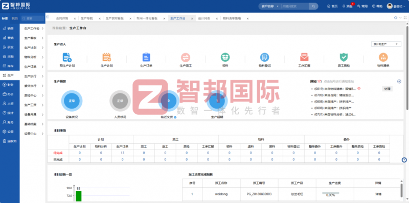智邦国际一体化ERP系统立足生产制造企业的业务特点与管理需求,以“一体化、数智化、协同化”为核心设计理念,整合营销、研发、生产、采购、仓储、财务、人资、办公等全业务环节,构建起全流程贯通、数据实时共享的数字化管理体系,为制造企业的数字化转型提供全方位赋能。