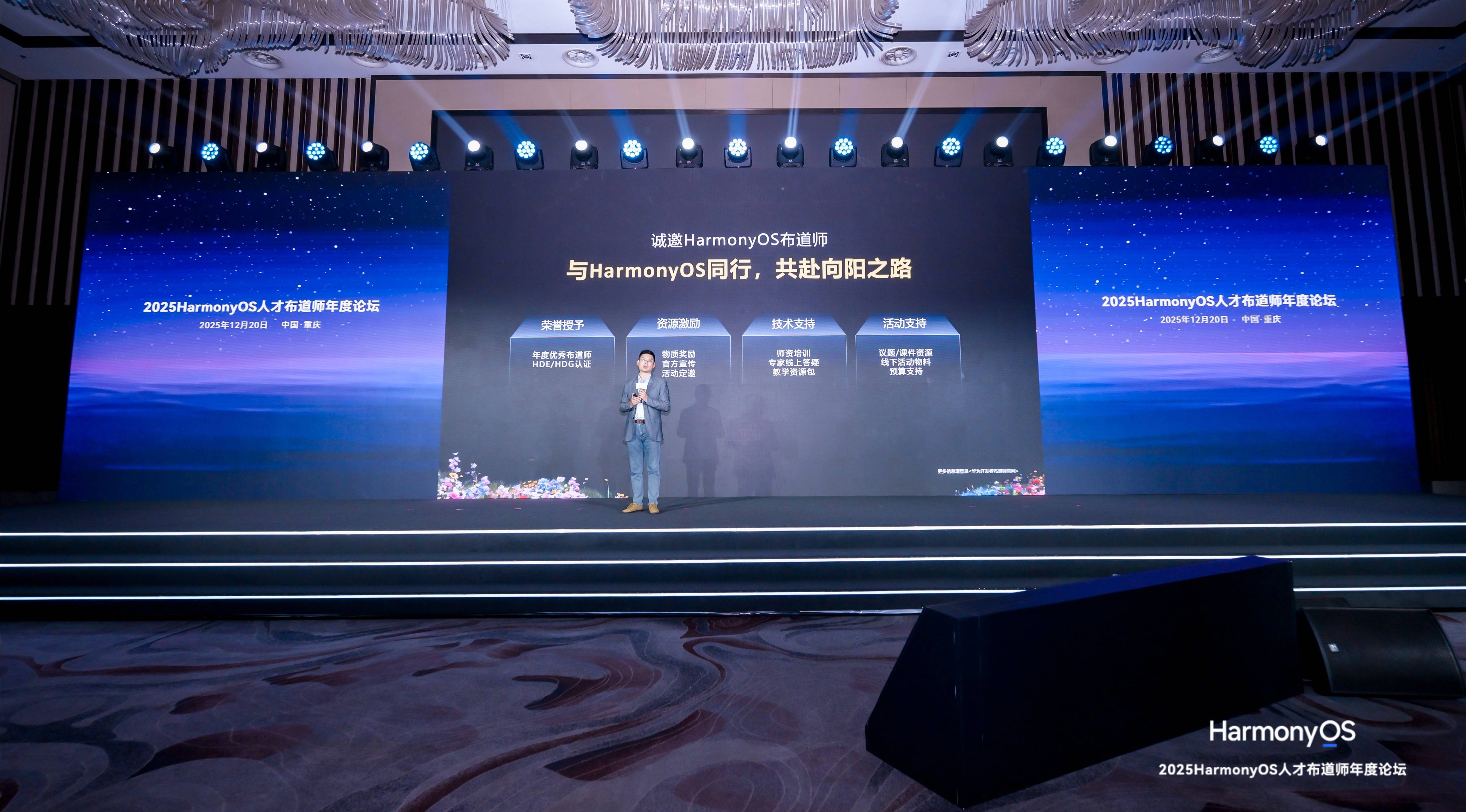 12月20日,“2025 HarmonyOS人才布道师年度论坛”于重庆举行。本次论坛不仅是一场对2025年度HarmonyOS人才发展的最新进展与成果的集中展示,更是一次凝聚产业界、教育界、开发者社区多方智慧,展望面向万物智联时代人才培养新范式的思想盛宴。数百位来自全国高校教师、HDE(华为开发者专家)、HDG(华为开发者社群)组织者,以及培训机构讲师们与鸿蒙生态建设者齐聚一堂,回顾鸿蒙人才生态从破土到成林的历程,表彰杰出贡献者,并就如何进一步深化产教融合、加速高质量人才培养进行深度探讨。