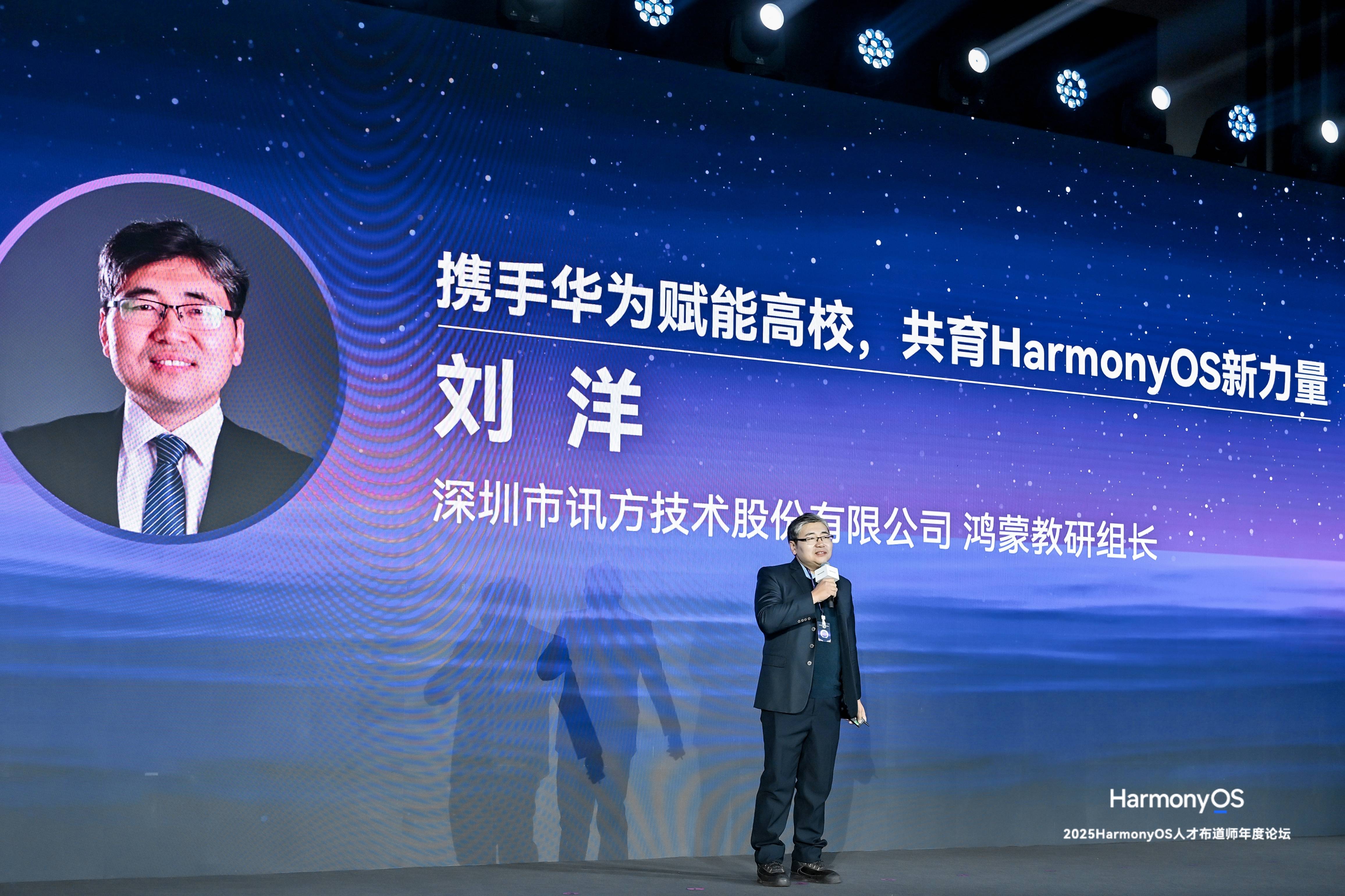 企业与社会机构是规模化、实战化赋能的关键力量。深圳市讯方技术股份有限公司鸿蒙教研组长刘洋,以培训机构视角讲述了如何将华为最新技术转化为教学实践。讯方作为华为HarmonyOS授权培训服务商,在2025年对接了40多所高校,设计融合鸿蒙开发的定制化人才方案,通过课程、认证、大赛助力学生打通就业链路,助力人才与岗位对接。