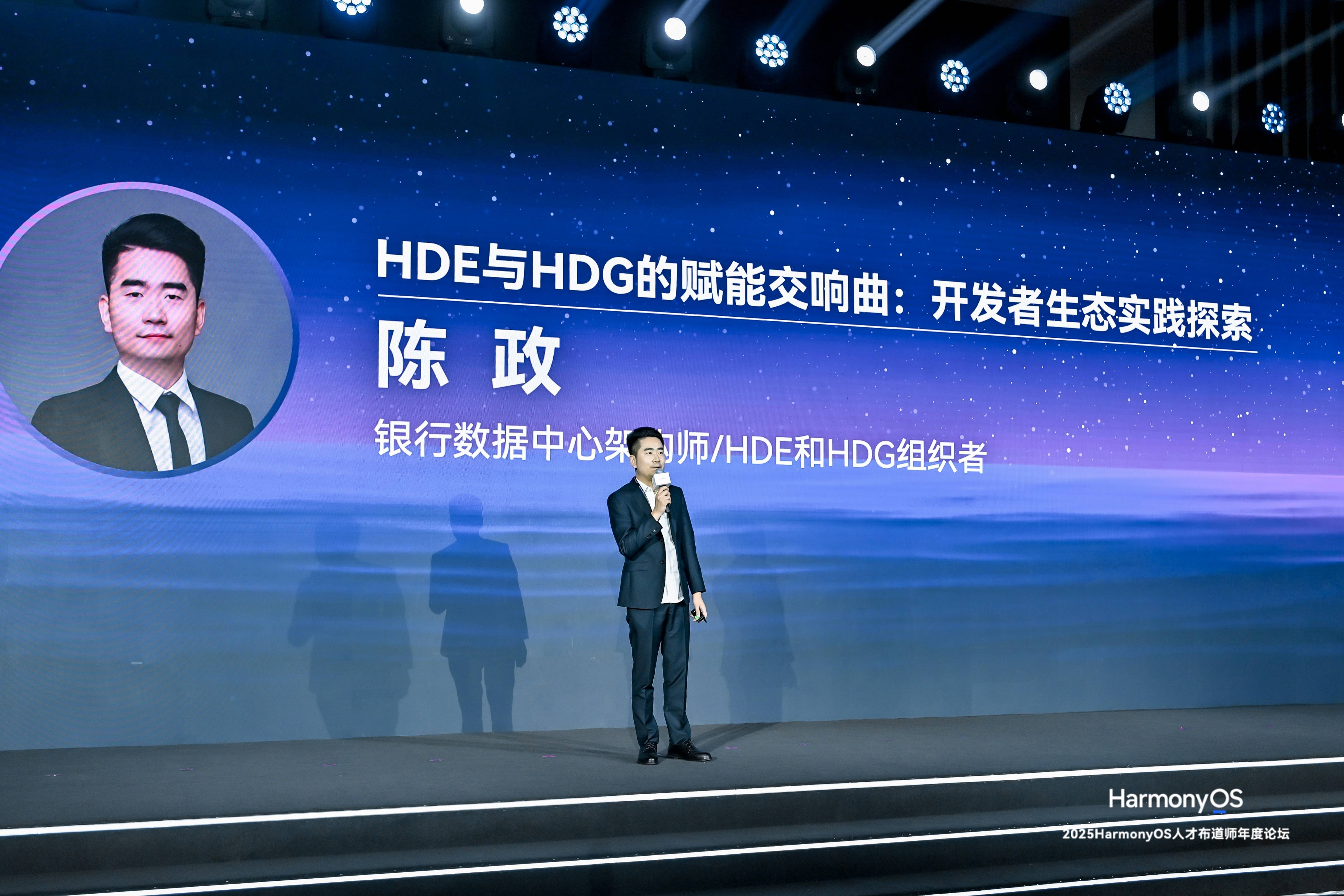 HDE与HDG组织者则是生态中最活跃的“联结者”与“传播者”。银行数据中心架构师兼HDE/HDG组织者陈政分享了他从开发者转变为鸿蒙生态布道者的实践经历。陈政通过持续的技术文章创作、社区答疑、线下活动组织与城市站拓展,不仅个人在鸿蒙生态中获得成长与收益,更有效激活了区域开发者社群,吸引了更多人才加入鸿蒙生态建设。这种自下而上的社区活力,正持续反哺技术生态的演进,展现了HDE与HDG体系在技术引领与社区联动方面的强大赋能作用。