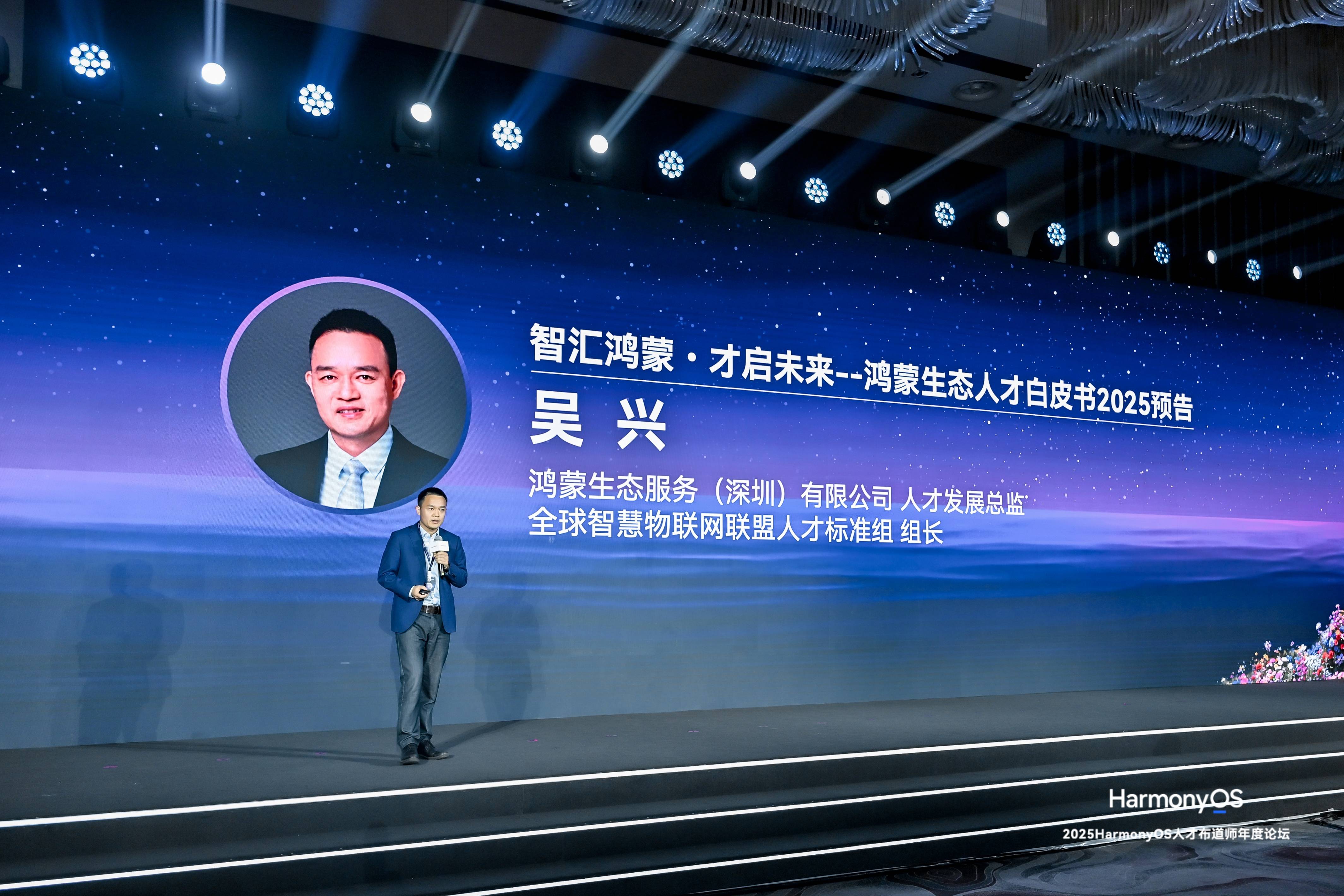 论坛上,鸿蒙生态服务(深圳)有限公司人才发展总监、全球智慧物联网联盟人才标准组组长吴兴,预告了即将发布的《鸿蒙生态人才白皮书2025》重要内容。该白皮书由16家机构的24位专家共同编撰,基于翔实的产业链调研与数据分析,系统呈现了鸿蒙人才供需现状、能力标准、培养路径及生态协同策略。白皮书旨在为鸿蒙人才的长远规划提供指引,推动人才标准建设与产教融合闭环,助力实现人才与产业的同频共振。