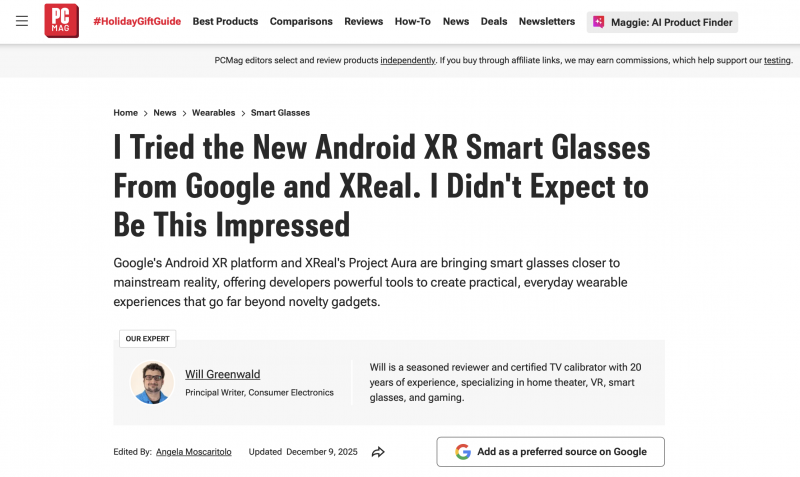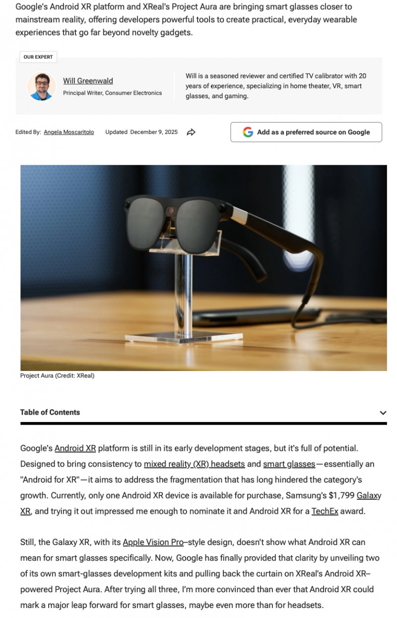 在 PCMag、CNET、Tom’s Guide 等权威科技媒体的实测报道中,Project Aura 被反复提及的关键词包括「超出预期」、「体验惊艳」、「真实实用」、「空间计算能力下沉」。多位体验记者指出,这款设备在保持轻量、可佩戴特性的同时,呈现出以往更多出现在高端 XR 头显中的能力组合,被视为「智能眼镜的关键飞跃」。