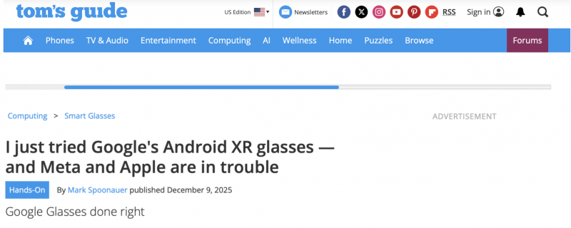 Tom’s Guide 从行业格局角度评价 Project Aura,指出这款眼镜成功将原本仅存在于头显中的 XR 能力,下沉到轻量化眼镜形态,为智能眼镜的日常化和规模化提供了现实可能。媒体认为,这一变化不仅提升了用户体验,也可能对 Meta、Apple 等 XR 企业的市场策略带来实质性压力——“Meta 和 Apple 恐怕要麻烦了!”