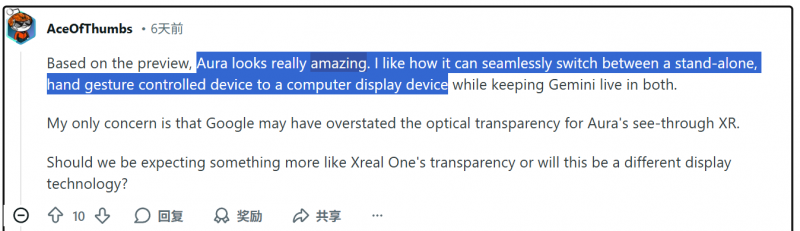在 Reddit 等国际社区中,不少用户已将 Project Aura 视为“XR 眼镜的首选方案”。有用户特别提到,全新的棱镜式光学设计显著减少了反射干扰,“这是未来智能眼镜的必备方向”;也有用户直言,70 度视场角本身,就是他们持续等待这款产品的唯一理由。