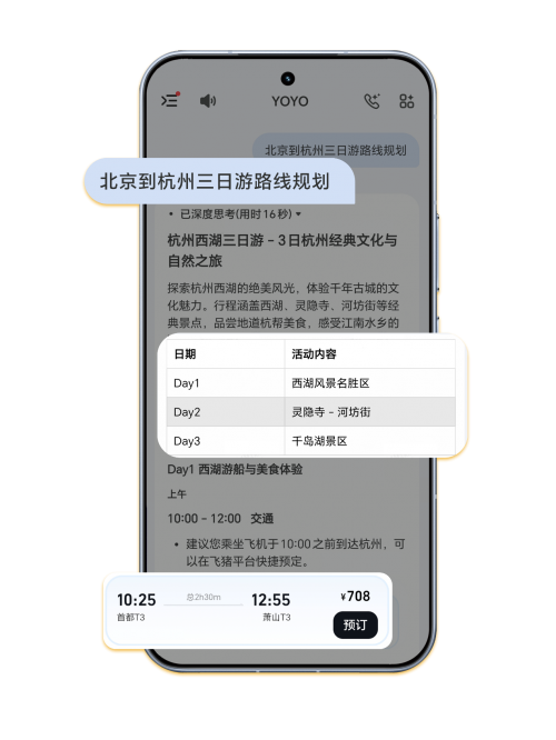 相较于传统App打开-搜索-筛选-查看的流程,如今用户则无需反复研究制定出游攻略、多平台比价,只需对YOYO说一句:“北京到杭州三日游路线规划”,它便能深度理解“短程”“小众”等用户意图,结合实时航班动态、酒店余房、景区人流数据等,分析整理出结构清晰的综合方案。如果临时想调整计划,只需告诉它:“第二天不想去西湖,有没有室内替代方案?”行程随之动态更新,灵活如私人定制。