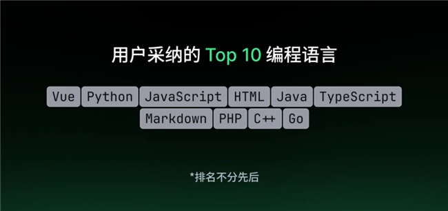 TRAE 能够适配多类专业的开发场景,用户采纳的 Top 10 编程语言包括:Vue、Python、JavaScript、HTML、Java、TypeScript、Markdown、PHP、C++、Go。