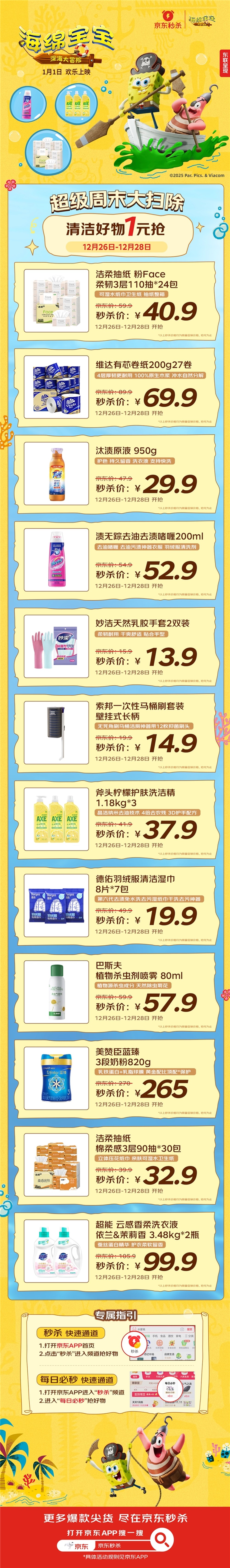 每年到了年底,家家户户都会进行大扫除。随着年末大扫除需求升温,12月26日-28日,京东秒杀频道推出“超级周末大扫除”活动,洁柔抽纸、汰渍洗衣液等多款家庭清洁明星单品限时秒杀。用户打开京东APP首页,点击“秒杀”进入频道即可参与抢购,在秒杀频道进入“每日必秒”活动页,还能以1元的价格秒杀衣服除菌液、香氛浴室清洁剂等。