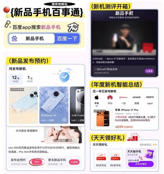 在百度APP搜索 “新品手机” ,就能看到达人内容、用户反馈、参数解读与全网比价功能。热门机型亮相后,这里的单日搜索量峰值能突破千万次,不仅为作者们提供了巨大的流量池,也大大加快了用户决策速度。