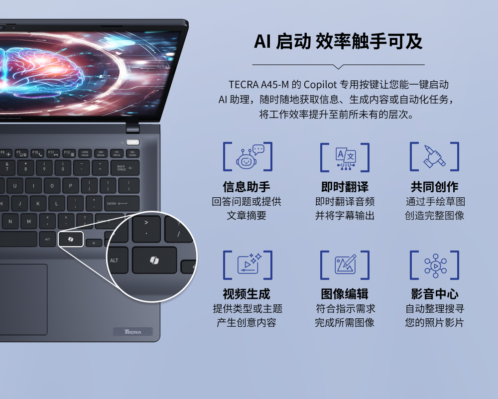 而TECRA A60-M采用的第二代Intel Core Ultra处理器,则聚焦“AI智能加速”。其内置的高级NPU AI 引擎与Xe2架构英特尔锐炫™GPU,在“AI驱动的专业任务”中表现突出:比如视频制作时的实时渲染、媒体转码时的效率提升,或是借助Intel AI Boost引擎优化Windows Studio Effects功能——
