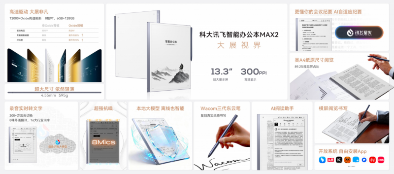 在这样的背景下,2025年12月28日,科大讯飞联合全球电子纸技术领导厂商E Ink元太科技,正式发布新一代13.3英寸电子纸办公设备——讯飞智能办公本MAX2。这款产品围绕“大屏、速度、清晰度”三项核心体验进行系统升级,面向深度阅读、书写与高频办公场景,探索电子纸设备在专业办公方向上的进一步演进。