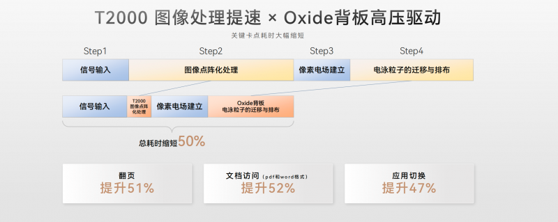 T2000是继元太在2019年发布T1000后,在时序控制芯片技术上的重大进步。相较于前代,T2000图像点阵化处理时间缩短至前代的十分之一,处理速度提升10倍以上。而Oxide背板技术能够以更高电压驱动粒子移动,相较于常规背板,Oxide氧化物背板技术在页面刷新速度上大幅提升约35%,同时能够降低约30%整体功耗。