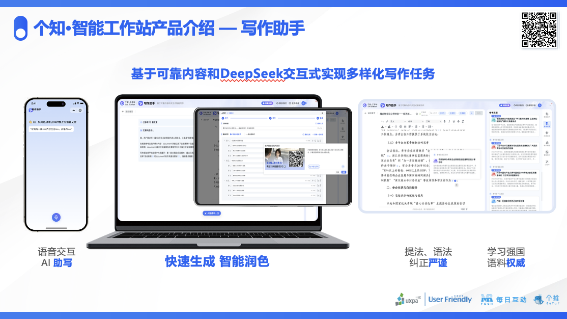 第二个思考,在所有必要环节中让用户有效参与,核心是保障效率与真实感反馈。我们推出的 “写作助手” 产品,通过后端大模型加持与本地知识库协同,让写作既保留个人特色,又能获得大模型支持。用户无需逐行书写,可通过语音交代想法,将核心观点拆分阐述,点击 “AI 优化交代” 按钮后,系统会将零散想法整理为简洁表达。随后,用户可勾选确认参考资料的用途(参考内容或参考风格),AI 会自动生成文章大纲,用户可对一级、二级标题进行增删改查、补充交代,让想法更具象清晰。生成原文后,针对用户普遍担心的 “AI 幻觉” 问题,我们设置了 “AI 事实核查” 功能:用户可选中存疑内容,AI agent 会分为正反两方,检索网络事实与知识库支撑点并呈现,由用户决定最终修改方向。此外,产品还支持润色、改写等文字加工功能,让用户专注于高阶思考,将基础的文字整理、资料检索工作交给 AI。