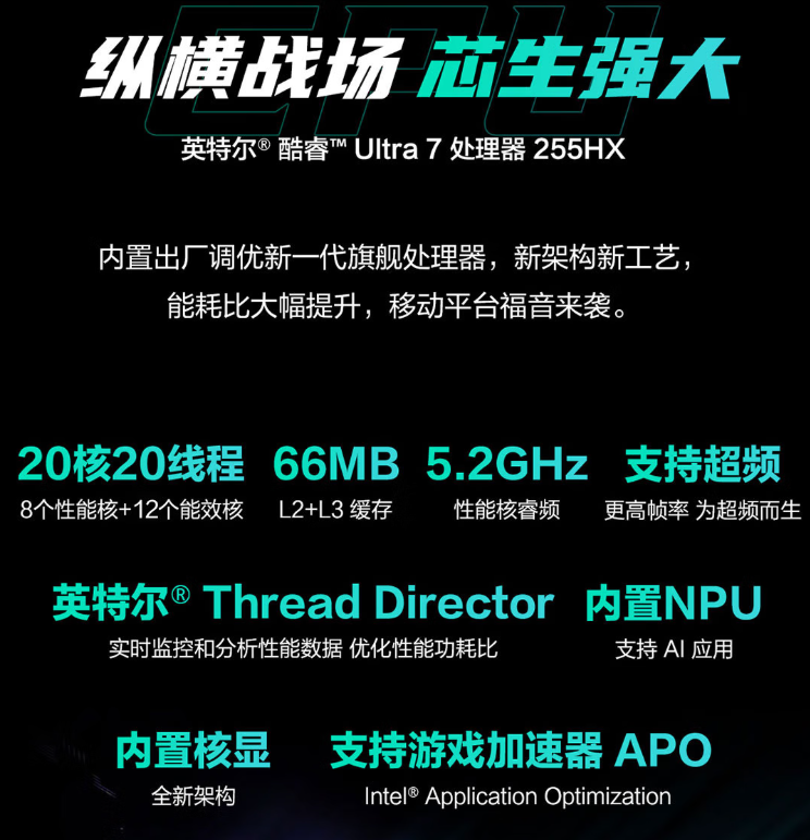 要平衡校园里“高性能”与“低干扰”的矛盾,离不开底层硬件的突破性革新。华硕天选6 Pro酷睿版搭载的英特尔酷睿Ultra 7 255HX处理器,采用全新混合架构与先进制程,不仅实现了能效比的跨越式提升,还首次为游戏本引入独立NPU单元,构建起CPU、GPU、NPU三位一体的XPU智能协同架构。这种设计让设备能智能感知使用场景——在宿舍玩游戏时自动释放性能,在图书馆办公时降低功耗与噪音,从硬件层面解决了传统游戏本“一刀切”的体验问题。