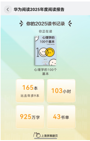 华为阅读的“2025年度阅读报告”终于被我等到了,一边翻阅报告,一边回忆这一年的阅读时光。这一年里,我零零散散读过的书、熬过的夜、摸过的鱼,这些碎片化的记忆都被华为阅读默默地收集起来,到了年底汇成一份“阅读档案”,不禁还有点小感慨。