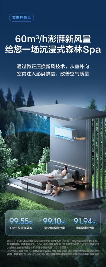 除了保障用户睡眠,TCL小蓝翼P7 Ultra AI健康空调还搭载TVOC气体传感器,通过新风标识颜色指示空气质量好坏,主动管理室内空气质量;同时拥有双循环新风系统,具备60m3/h澎湃新风量,通过微正压换新风技术,从室外向室内注入澎湃鲜氧,改善空气质量,一晚能够焕新12次卧室空间的空气。而在室外空气质量差时,则开启空调内循环净化,通过离心动力将污浊空气高效过滤再次释放至室内,时刻守护用户的健康呼吸。