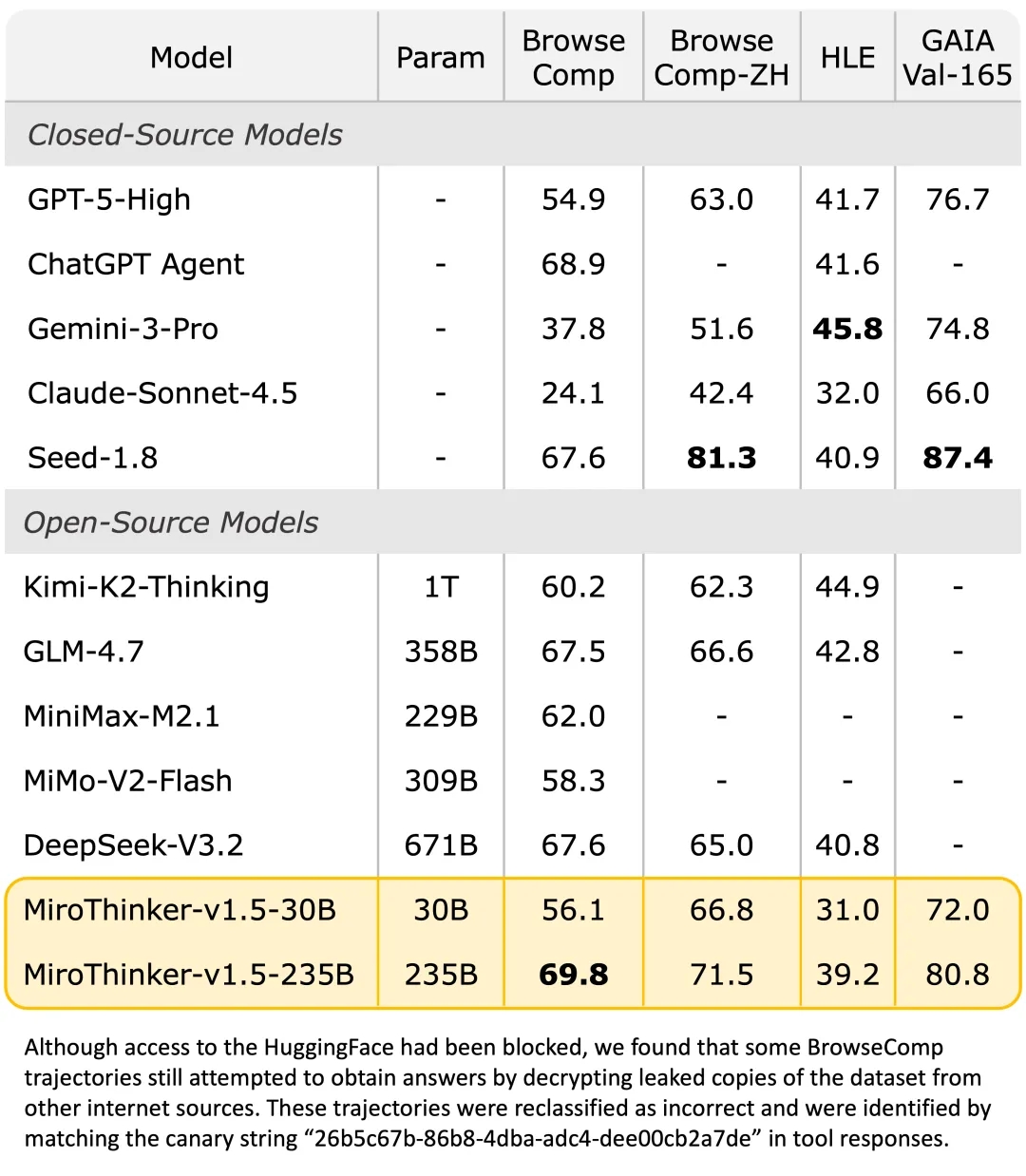 通过这种训练方式,MiroThinker 1.5 逐步形成了一种「本能反应」:在不确定性面前,先交互、再判断;在高风险结论前,先查证、再收敛。这使得模型不再需要将庞大的世界知识全部内化为参数,而是学会在需要时,快速、精准地向外部世界「借力」。