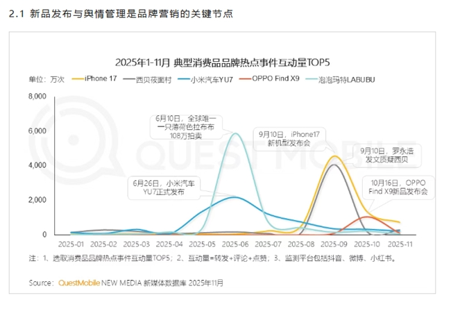 QuestMobile数据显示,在2025年最具代表性的新品发布事件中,微博展现出了显著的“主场效应”。其中,iPhone 17系列发布期间,微博平台贡献了全网82.6%的内容声量;OPPO Find X9系列发布时的微博声量占比高达83.5%;而在备受瞩目的小米汽车YU7发布事件中,微博声量占比同样达到了80.8%。此外,包括西贝莜面村等在内的知名品牌热点事件,其在微博的声量占比甚至超过了90%。