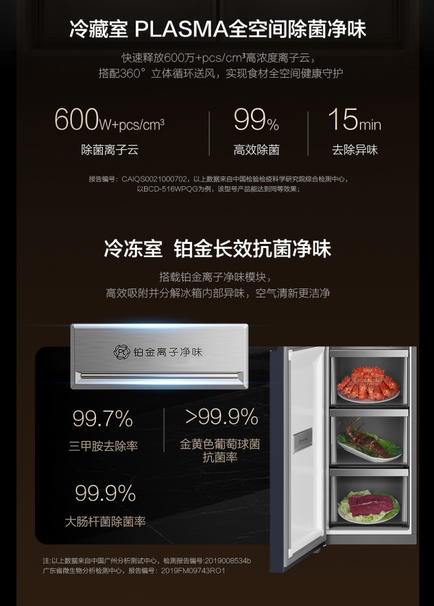 冷冻室则采用铂金长效抗菌净味模块,通过铂金离子净味,高效吸附并分解异味的方式,实现三甲胺去除率 99.7%、金黄色葡萄球菌抗菌率 99.9%、大肠杆菌除菌率 99.9%的全面净化效果。这种冷藏冷冻全空间净化的设计,确保减少细菌和异味,提升食材安全。