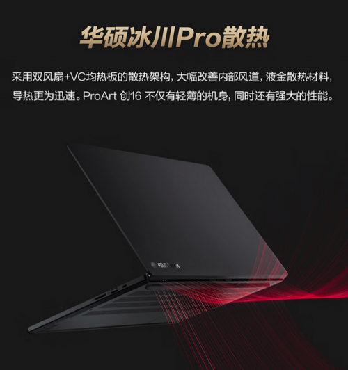 在进行渲染、输出成片时,笔记本通常处于满功率运行状态,机身温度会迅速上升,这时候笔记本容易出现因为温度过高造成CPU降频现象,从而导致运行出现卡顿。因此,除强劲性能外,还需强大的散热系统来保障运行稳定性。华硕ProArt创16 2025采用冰川Pro散热技术,运用双风扇+VC均热板的散热架构,大幅优化内部风道,能够快速带走热量;配合液态金属,可有效降低CPU温度,避免因温度过高而出现降频现象,让笔记本在工作中始终保持最佳性能。
