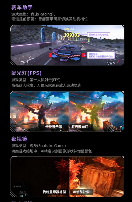 与市面上只对“画面增强”做浅层处理的轻量级 AI 功能不同,AG277UX 的 AI 定制芯片能够进入游戏实际运行逻辑中,根据多款热门游戏的典型战斗场景,实现“游戏内智能辅助”,提供更具针对性、更智能化的反馈。无论是 赛车类游戏 对转弯节奏的提前预判、射击类游戏 中对敌方轮廓的聚焦强化,还是 格斗类游戏 里对血量风险的即时提醒,AG277UX 都能在不同战斗环境下给出最契合的智能反馈。再结合低输入延迟、动态准星、狙击镜辅助、FPS/RTS游戏模式等电竞黑科技,AG277UX 让智能预判与玩家操作形成真正的协同效应,带来前所未有的主动式智能游戏体验。