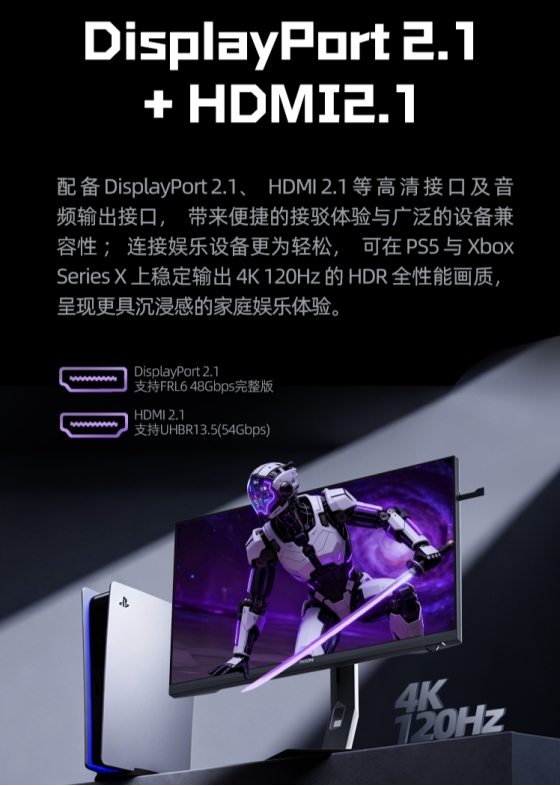 AG277UX 不仅是一台高性能电竞装备,更以全能化设计融入多元生活场景。整机延续 AGON 机甲美学风格,1mm 微边框搭配多边形底座,线条干净利落;背部 Light FX 音乐律动炫彩氛围灯支持14种灯光秀及超10万种颜色随心设定,轻松营造沉浸式电竞氛围。人体工学方面,提供四向调节支架、慢回弹耳机挂钩与快拆结构,长时间使用依然舒适便捷。连接扩展性强悍,配备 DisplayPort 2.1、HDMI 2.1 及支持BC1.2协议的 USB 3.2 Gen1 快充接口,轻松接驳主机、影音设备与移动终端。在长时间观看与游戏使用中,AG277UX 通过不闪屏技术与硬件级低蓝光面板,从源头降低视觉疲劳,为用户提供更健康、持久的使用体验。综合性能、美学与贴心细节于一体的 AG277UX,为用户带来超越单纯电竞装备的多场景高端体验。