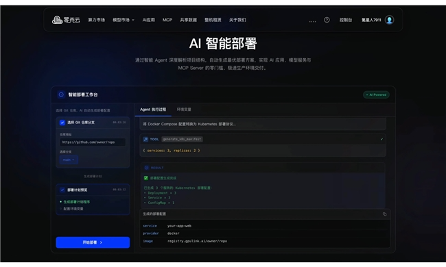 对于驱动这场变革的广大Vibe Coding创作者而言,平台实现了至关重要的 “部署0门槛” 。其智能部署引擎无缝支持从GitHub、Cursor、HuggingFace等主流平台快速接入,通过AI自动解析代码结构与环境依赖,实现分钟级应用上线与全自动化部署。这彻底解决了Vibe Coding模式下快速迭代与工程化稳健交付之间的矛盾。