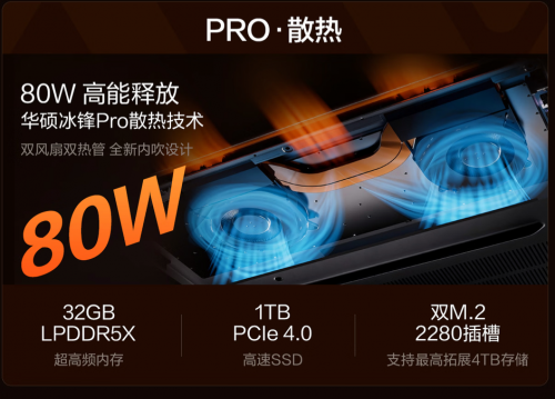 配合华硕冰锋Pro散热技术,双风扇双热管、75mm游戏本级大风扇、D10超粗热管以及内吹式散热设计,实现至高80W性能释放。标配32GB LPDDR5X超高频内存以及1TB PCle 4.0高速SSD(至高支持拓展至4TB超大存储),轻松应对多任务处理、办公娱乐创意设计。同样内置断网可用的“小硕知道”AI智能助手。