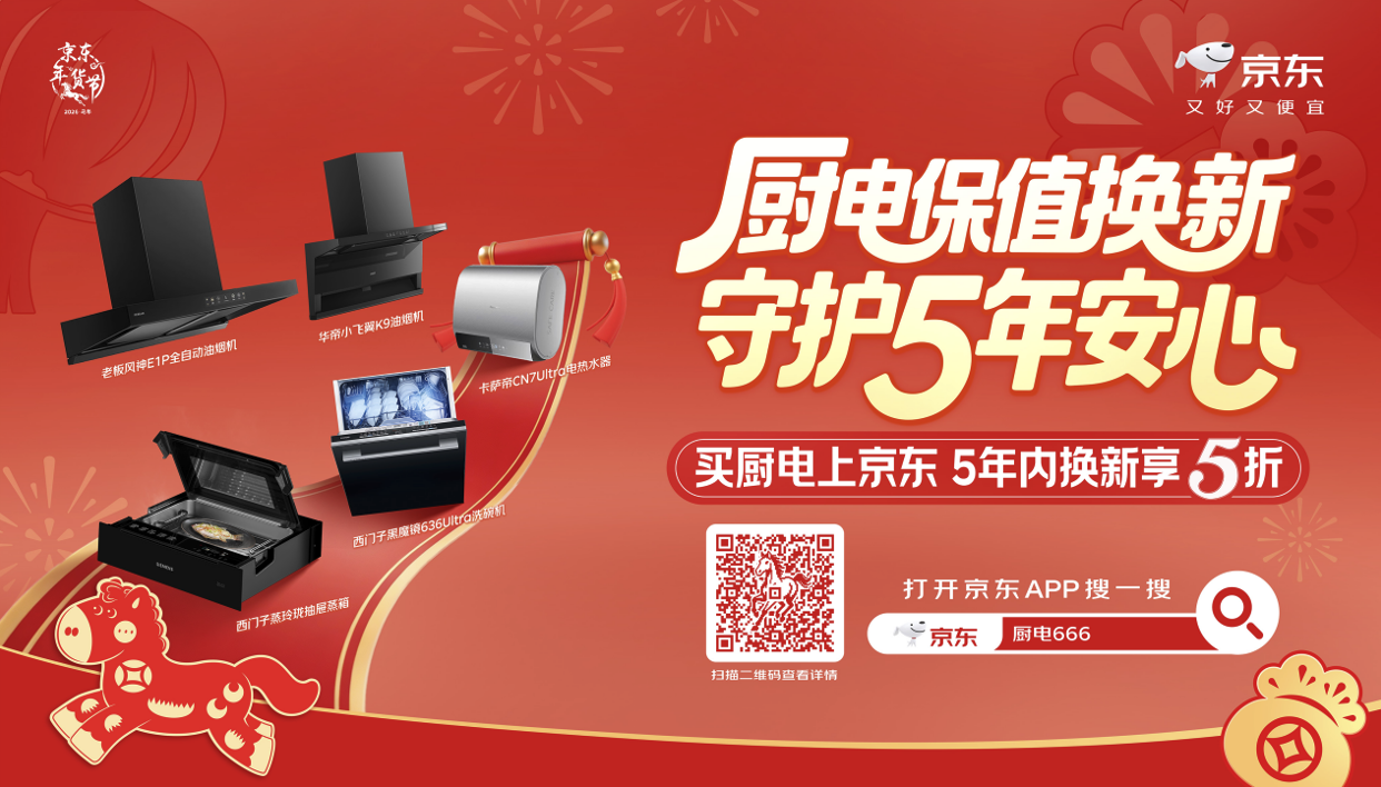 新国标把“安全使用年限”明确为可对照、可识别的标准后,消费者对厨电换新的判断依据也随之更清晰:既要把钱花得值,也要把风险控得住。基于这一变化,京东厨卫大家电年货节在会场优惠与政策补贴之外,进一步把保障前置到购买环节,通过“厨电保值换新,守护5年安心”的权益服务,让消费者在买厨卫大家电又好又便宜的同时,获得可长期兑现的使用安全感。