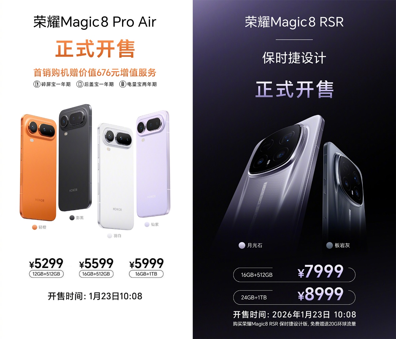 1月19日,荣耀重磅发布两款旗舰新品——满配轻薄影像旗舰「荣耀Magic8 Pro Air」与系列顶级旗舰「荣耀Magic8 RSR 保时捷设计」。