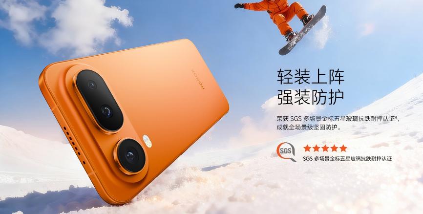 耐用性上,该机依托超坚韧荣耀蝉翼架构、航空铝一体化中框及荣耀巨犀玻璃的三重加持,不仅实现Pro级耐弯折性能,更荣获SGS多场景金标五星玻璃抗跌耐摔认证,搭配IP68+IP69级防尘抗水,全方位保障使用稳定可靠。