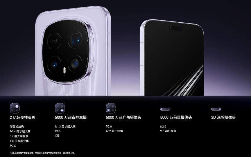影像方面,该机搭载荣耀超夜神影像系统,由5000万像素超夜神主摄、2亿像素超夜神长焦及5000万像素超广角镜头组成,配合全新AiMAGE原色引擎,全维度还原真实色彩;辅以AiMAGE夜神引擎、防抖引擎与人像引擎,大幅提升拍摄能力,轻松拍出电影级人像大片,内置灵感帮拍与AI追色功能,搭配全新专业影像套装,进一步拓展拍摄边界。