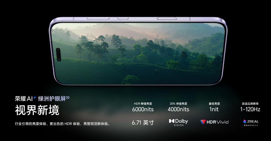 其他方面,该机采用6.31英寸荣耀AI绿洲护眼屏,具备6000nits HDR峰值亮度,更搭载10大荣耀绿洲护眼科技,带来极致护眼体验;同时,配备立体声双扬声器、3D超声波指纹、SIM&eSIM四卡双待、全品牌互联互通等旗舰配置与功能,全方位拉满使用体验。