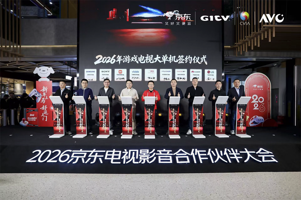 近日,2026京东电视影音合作伙伴大会暨游戏电视标准发布&年货节启动仪式圆满结束。中国电子视像行业协会、银河互联网电视、奥维云网、哔哩哔哩(下文称:B站)等行业代表,以及头部电视品牌负责人共同出席活动。会上,京东联合奥维云网、中国电子视像行业协会、B站共同发布《游戏电视3.0标准白皮书》,进一步明确游戏电视3.0时代的行业新标准,并与海信、TCL、索尼、三星、LG、小米、雷鸟、Vidda、酷开、华为、长虹等电视品牌,在现场签署共计近60万台大单采购协议,加快推动游戏电视的普及。