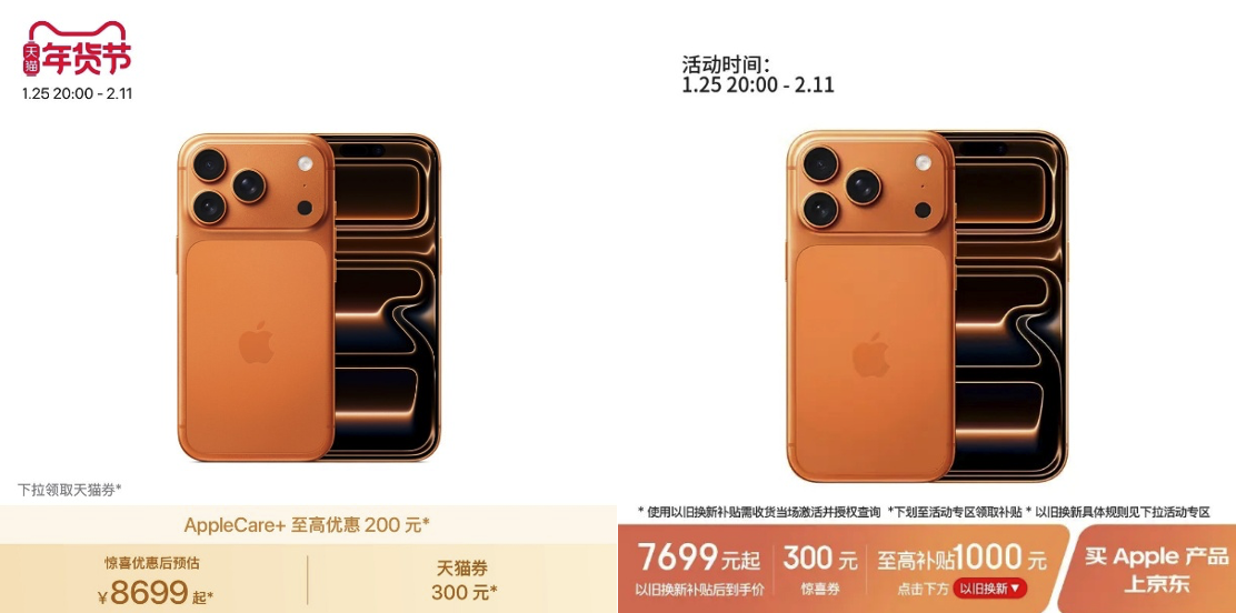 在高端机型方面,iPhone 17 Pro在天猫可享300元优惠券,到手价为8699元,以旧换新最高补贴550元;京东在提供300元优惠券的同时,以旧换新补贴最高可达1000元,补贴后到手价7699元起。iPhone 17 Pro Max的对比更为明显:双方均提供300元优惠券,但京东以旧换新补贴高达1100元,是天猫550元补贴的两倍。