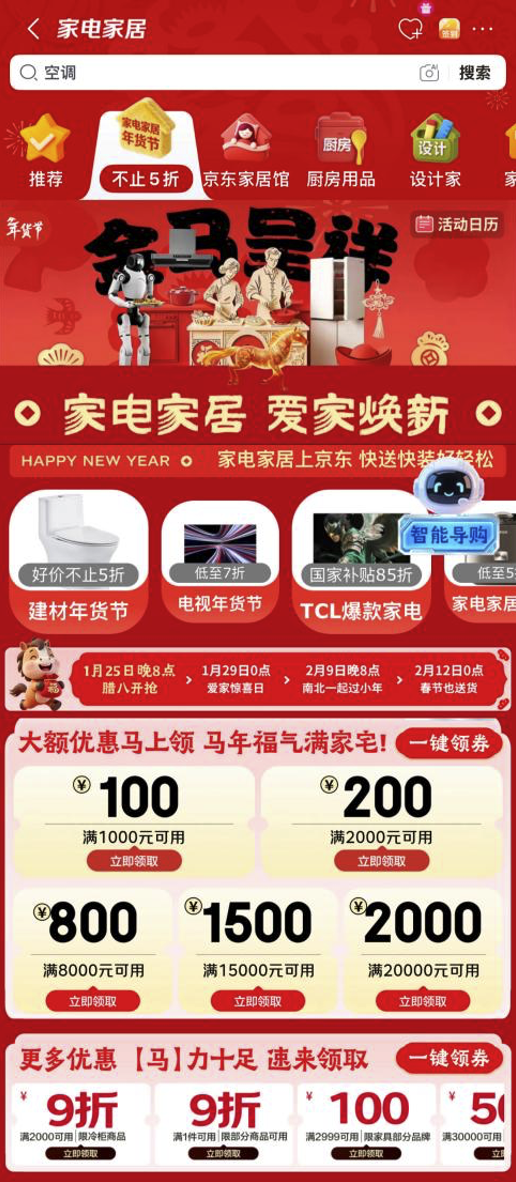 家电家居上京东,快送快装好轻松。即日起打开京东APP搜索“家电家居年货节”,轻松选购全家所需,更值得期待的是,1月29日到30日,爱家秒杀惊喜日活动上线,家电家居不止5折,快送快装服务保驾护航,让您安心省力,过个焕然一新的团圆年。