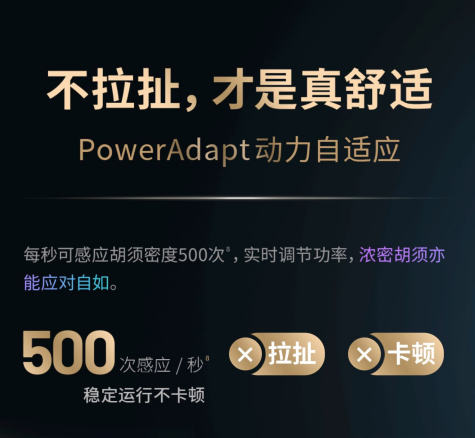 好用的剃须刀必然兼顾实用性与肤感体验,这也是该款值得入手的核心原因之一。SkinIQ水感顺滑舒适圈每平方厘米分布500,000颗微珠,可降低50%的肌肤摩擦,即便干剃或处理粗硬胡须区域也能顺畅剃刮,避免卡顿摩擦,兼顾实用与舒适。PowerAdapt动力自适应系统凭借强劲感知能力,每秒500次捕捉胡须密度,智能调节动力输出与震动幅度——粗硬区域加大动力,细软区域放缓转速,既保证动力适配性,又提升剃须精准度。借鉴汽车悬挂技术的全向精控刀头,具备20%自适应微角度贴合能力,无需用力按压即可精准贴合复杂脸型轮廓,无论是下颌线、嘴角等难剃部位,还是不同胡须分布区域,都能实现精准剃须,也能安心使用,实用价值全面拉满。